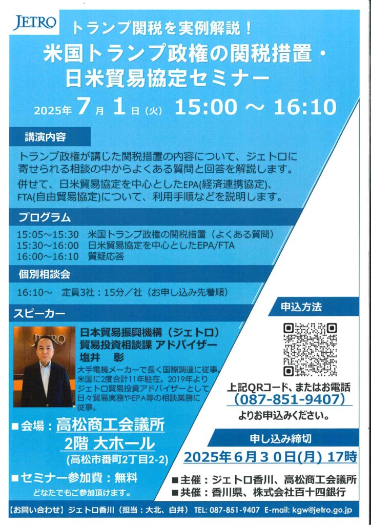 Home > セミナー・講習会 > 【ジェトロ香川】米国トランプ政権の関税措置・日米貿易協定セミナー(7月1日)