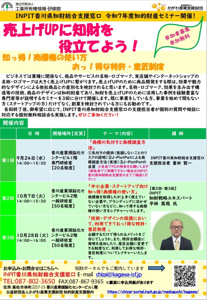 Home > セミナー・講習会 > 【INPIT香川県知財総合支援窓口】 令和7年度知的財産セミナーのご案内