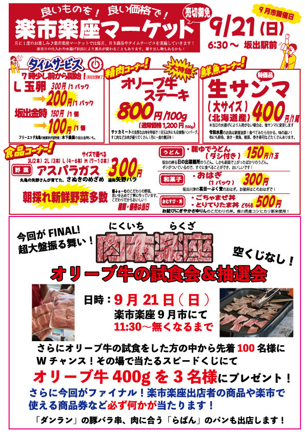 七月市から始まった「肉市楽座」はいよいよFinalを迎えます。肉を食べて暑い夏を乗り切ろう!をテーマに、約100名の方にオリーブ牛の無料試食を行います!さらには試食会に参加していただいたらオリーブ牛をはじめ楽市楽座でお得な賞品が必ず当たる大盤振る舞いな抽選会に参加できます(先着100名限定)。試食・抽選については11:30より行いますのでぜひご注目ください!