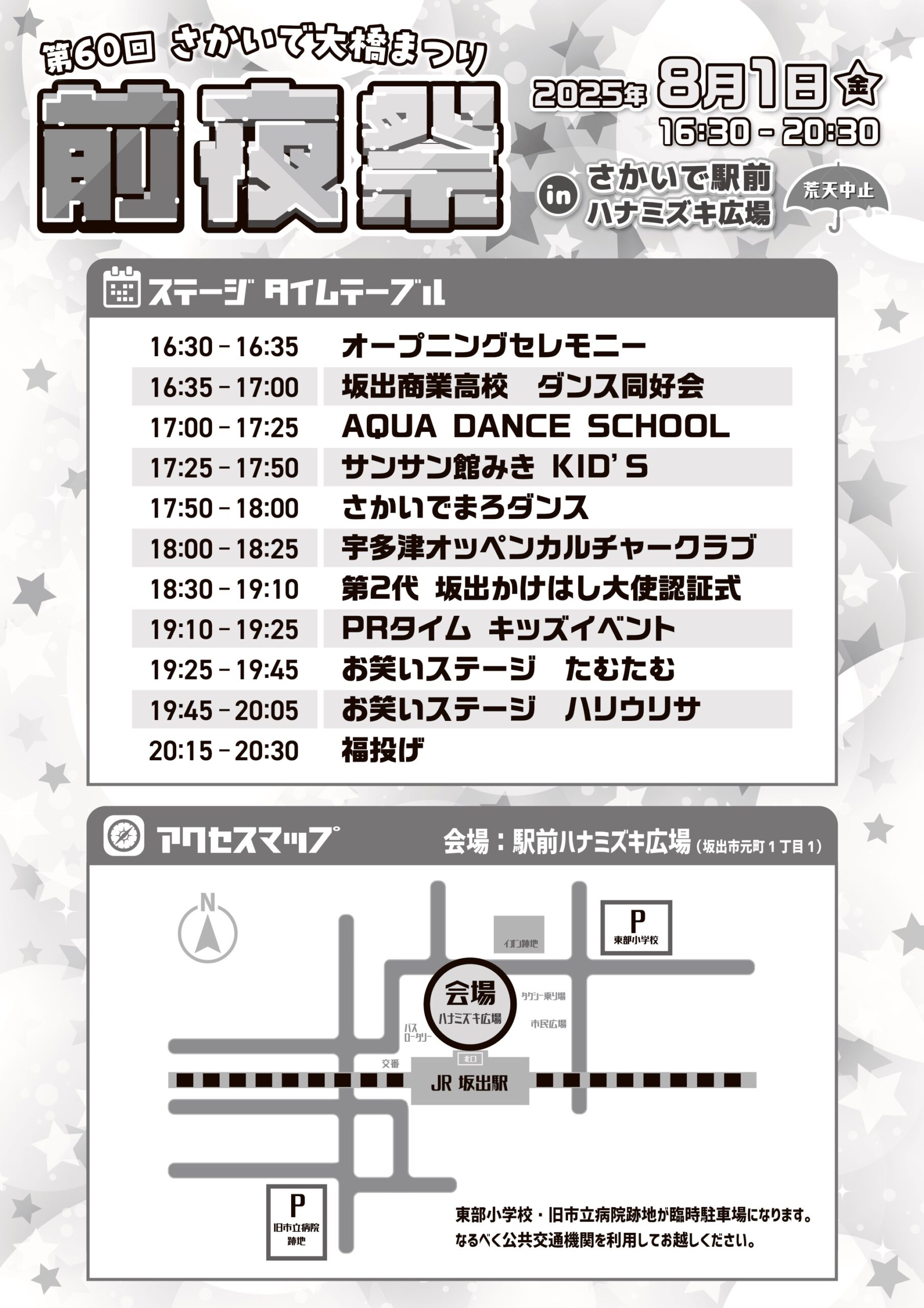 2025年7月1日 / 最終更新日時 : 2025年7月1日 yeg_admin おしらせ 第60回さかいで大橋まつり前夜祭開催!! 今年も暑い熱い夏がやってきます。 当所青年部が前夜祭を主管します。 今回は第2代目となる坂出かけはし大使の認証式が行われます。 目玉イベントとしては「福投げ」、さらには、お笑いライブやキッズダンスなど楽しいイベントが満載です。 是非ご来場いただき、楽しい時間を過ごして下さい。 日時:8月1日(金)16:30~20:30 場所:JR坂出駅前ハナミズキ広場(荒天中止) FacebookXCopy コメントを残す コメントをキャンセルメールアドレスが公開されることはありません。 ※ が付いている欄は必須項目ですコメント ※ 名前 ※ メール ※ サイト 次回のコメントで使用するためブラウザーに自分の名前、メールアドレス、サイトを保存する。